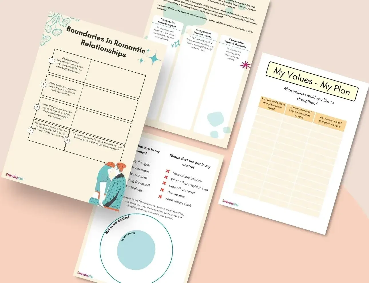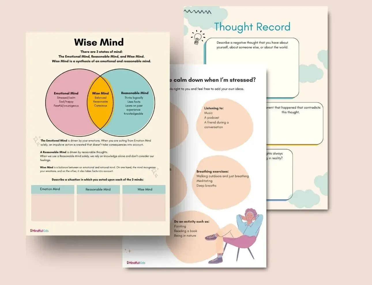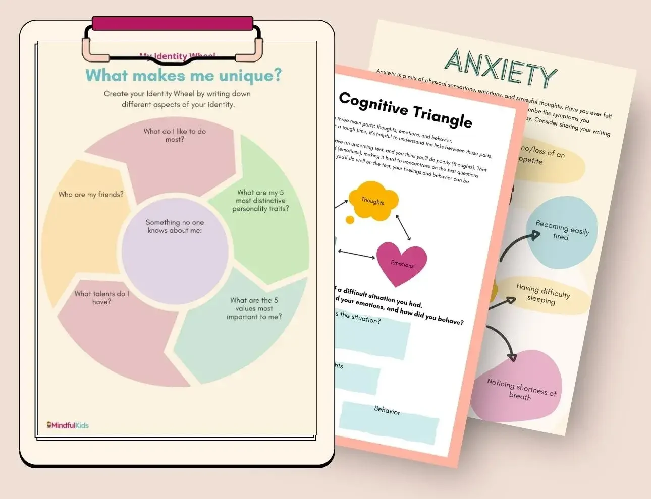 ”Effektiva mindfulness- och KBT-arbetsblad som hjälper barn att känna igen och reglera känslor – perfekt för terapisessioner.”