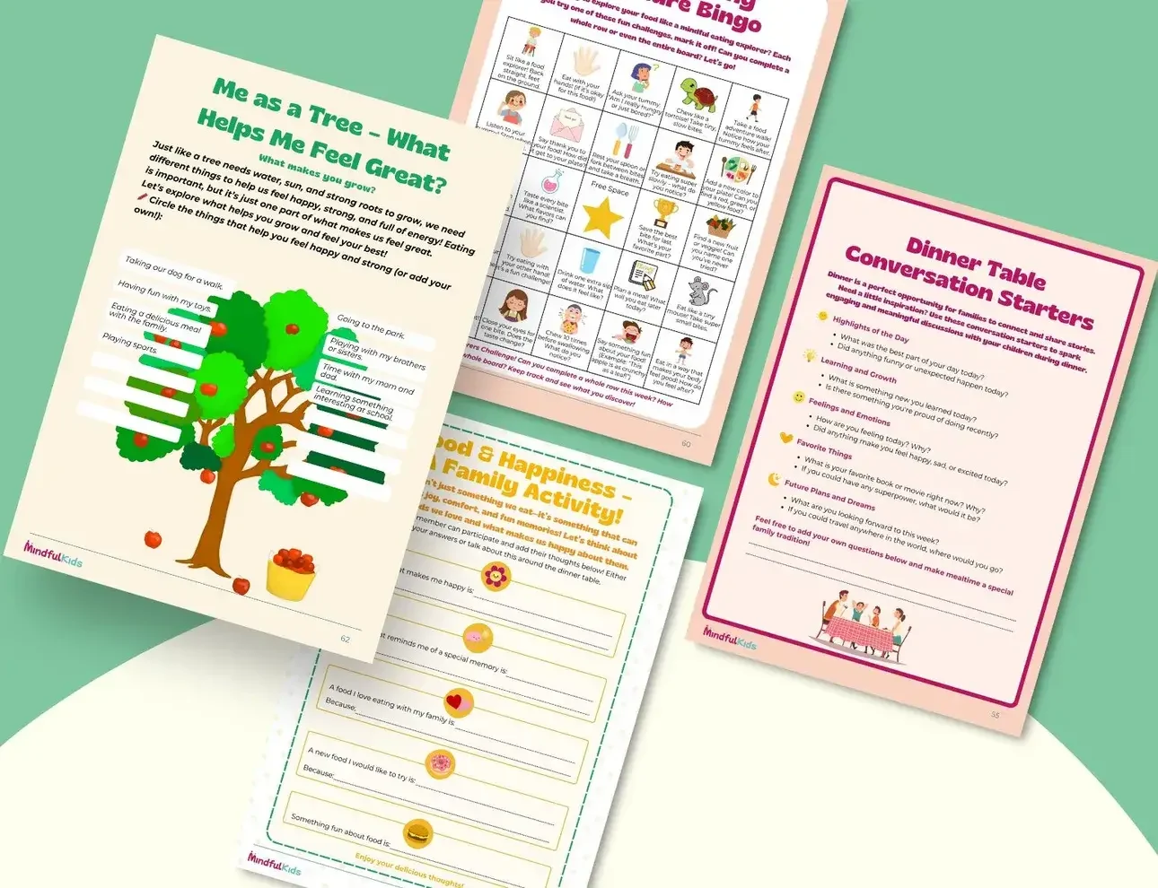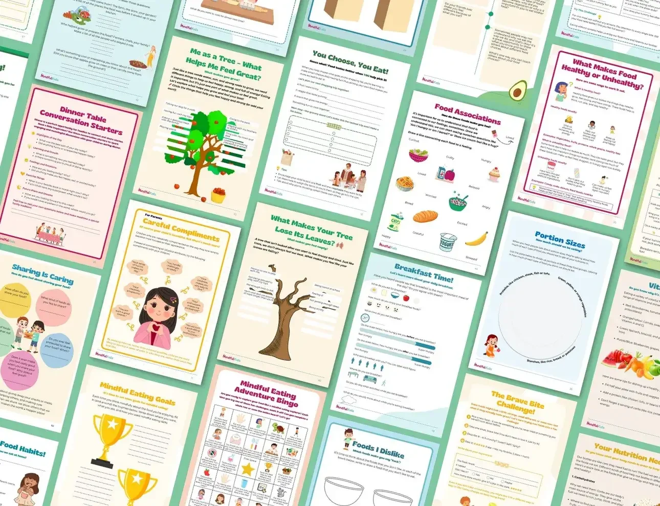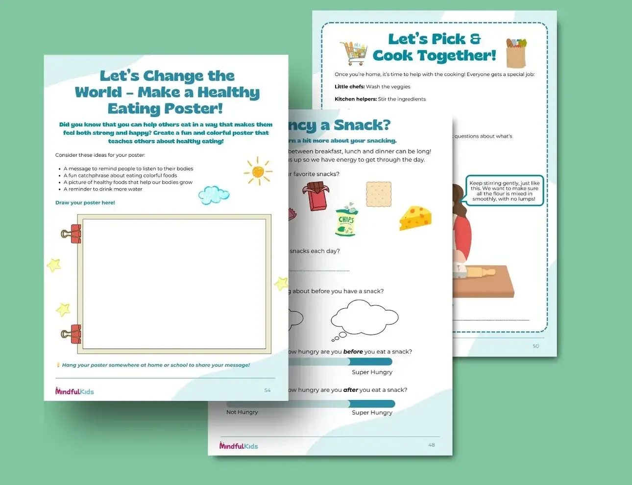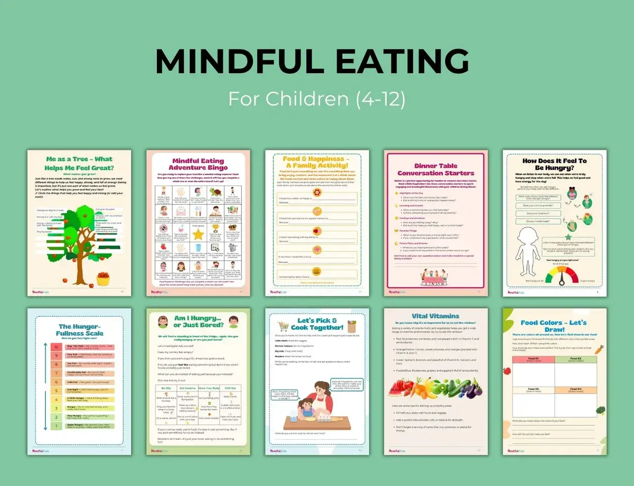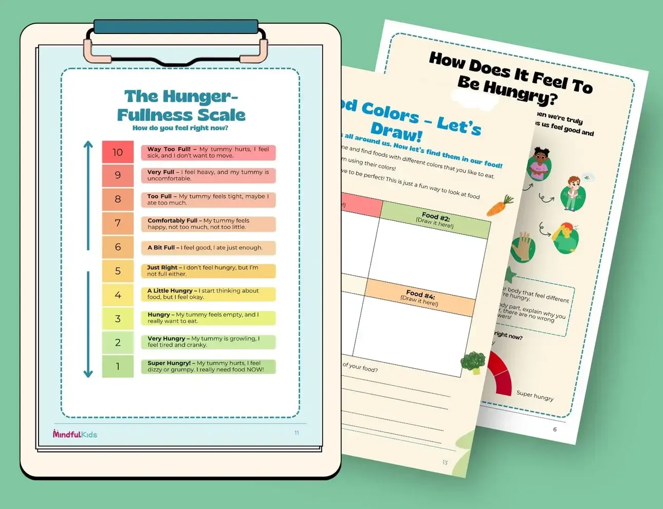Det är en PDF-arbetsbok för barn fylld med interaktiva övningar som hunger/mättnadsklassificeringar, smakaktiviteter, matjournaler och tacksamhetsuppmaningar.